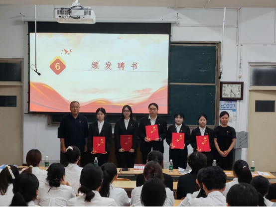 总结发言后,大会进入温情时刻。吕明哲与于萍共同为第十四届学生会成员颁发聘书,充分肯定他们过去一年的辛勤付出与卓越贡献,现场响起热烈掌声向卸任成员致以感谢与敬意。