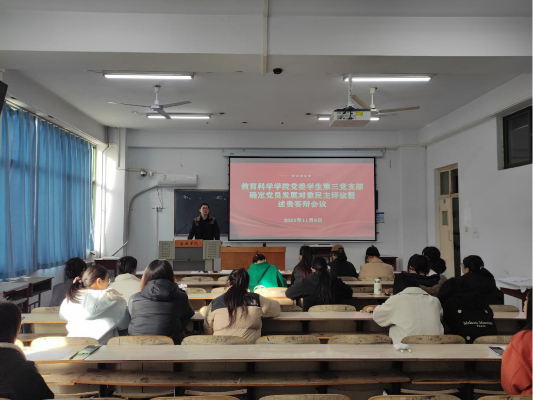 为严格把控党员发展“质量关”,检验入党积极分子一年多来的学习成果和思想动态,教育科学学院学生第三党支部于2025年11月9日在A11-304教室举办了拟推荐发展对象党员群众民主评议暨述责答辩会议,学院组织员兼学生第三党支部书记胡海洋、党支部组织委员张红莉老师,和胡新新、李明宇两位支部委员担任此次评委,党支部超过半数正式党员到会参加评议,另有10名有代表性的群众和团员参加本次评议会议。